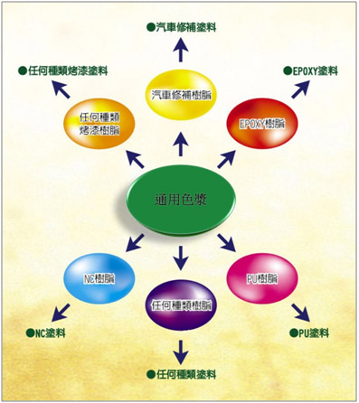 - 厂商使用多用途高质量的通用树脂研磨成通用色浆,然后添加基本原料及由不同功能与用途的涂料树脂所做成不同功能与用途的调色基础原料 ( 如调色光油、中间半成品光油等 ),依据顾客的需求,选择不同的调色基础原料,而做成顾客所需要的色漆。