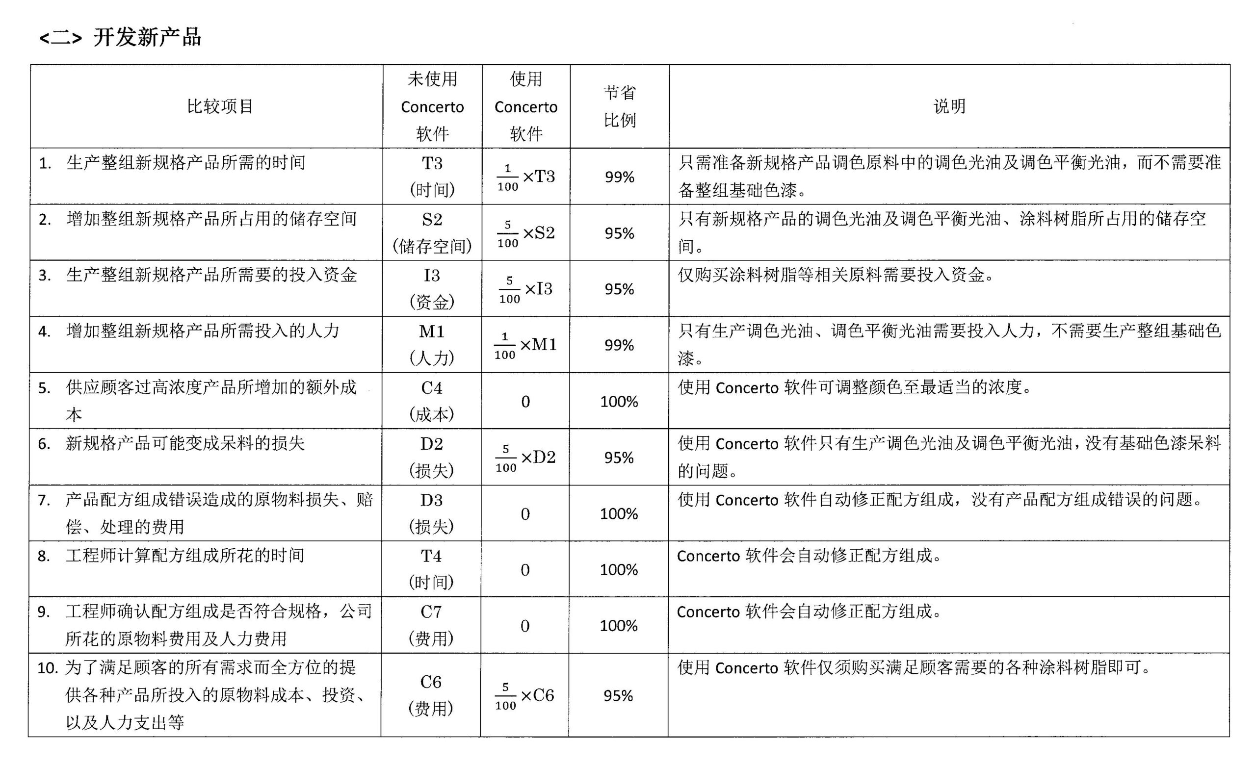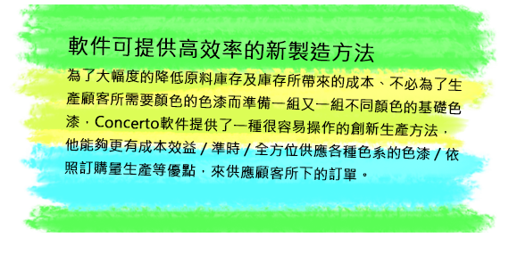 为了大幅度的降低原料库存及库存所带来的成本、不必为了生产顾客所需要颜色的色漆而准备一组又一组不同颜色的基础色漆,Concerto软件提供了一种很容易操作的创新生产方法,他能够更有成本效益 / 准时 / 全方位供应各种色系的色漆 / 依照订购量生产等优点,来供应顾客所下的订单。