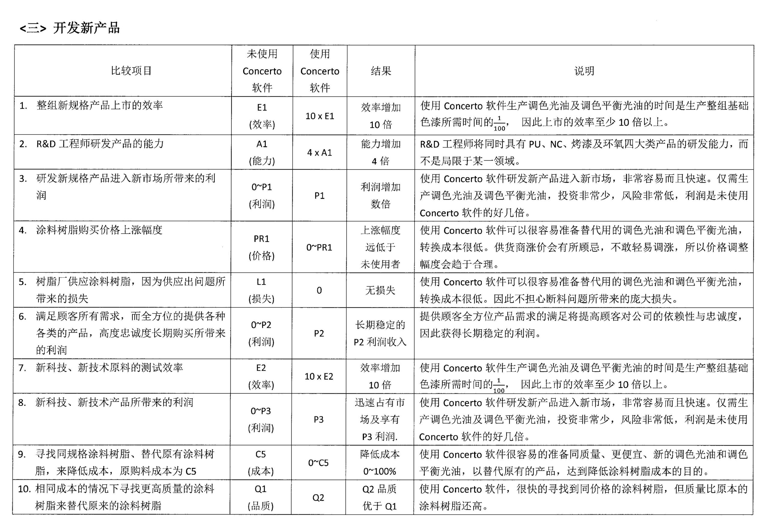 现实面的业务挑战,是Concerto技术软件出现的原因。软件的研发者,也就是Concerto Tech关系企业「炤信企业公司」(www.chep.com.tw),立足于台湾。在竞争激烈的台湾涂料市场已是领导品牌,以往同样面临种种业务挑战,除了维系既有业务量并兼顾获利水平,拓展业务追求成长一直是最大目标。面对价格敏感性高的台湾涂料市场,利润压缩导致成本控管必须非常严谨,才能掌握涂料厂的营运成本。面对这些挑战,主修化学工程领域的炤信企业黄总经理,本身在油漆/涂料行业已拥有超过30年经验,藉由开发Concerto技术软件,让复杂耗时的配方运算精简化变成可能,也因此迅速提高了公司制作配方的同仁之工作效率。因应特殊需求所开发的Concerto涂料技术软件,不仅仅能制作符合物化性规格性能的新产品配方组成,更能快速制作不同色系色漆的配方组成而能支持销售的成长。使用Concerto 技术软件可以使用直接混合成份的方法来生产产品,而这些成份是不需要事先做成中间半成品的。这种生产产品的方式是直接混合通用色浆、基本原料、调色光油、调色平衡光油 ( 尚未完全配方化的中间半成品 ),而软件可以迅速完成这些复杂的计算过程。